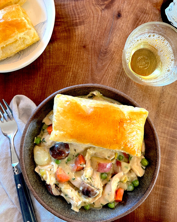 And for the ease of reheating as well as the use of compostable containers (most of which are not oven-safe) we've deconstructed our Chicken Pot Pie into the pie filling and the pastry.