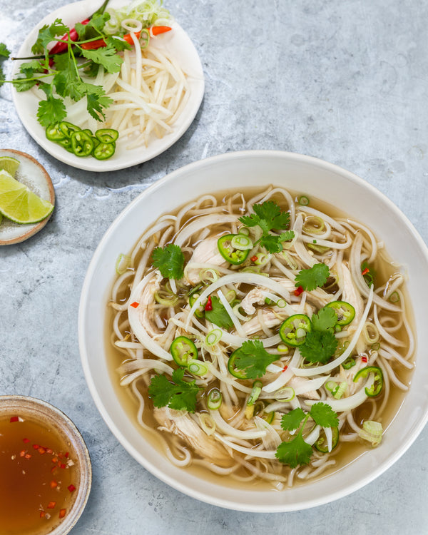 Phở Gà is the chicken version of Vietnam's famous beef noodle soup, named for its slippery rice noodles, bánh phở. The savory and lightly spiced broth and dipping sauce are the stars of the show.
